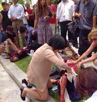 目击者说,当1点不到时,两名中年华族男子在莱佛士地铁站外的草地上起争执,接着一名男子就对另一位行凶。
