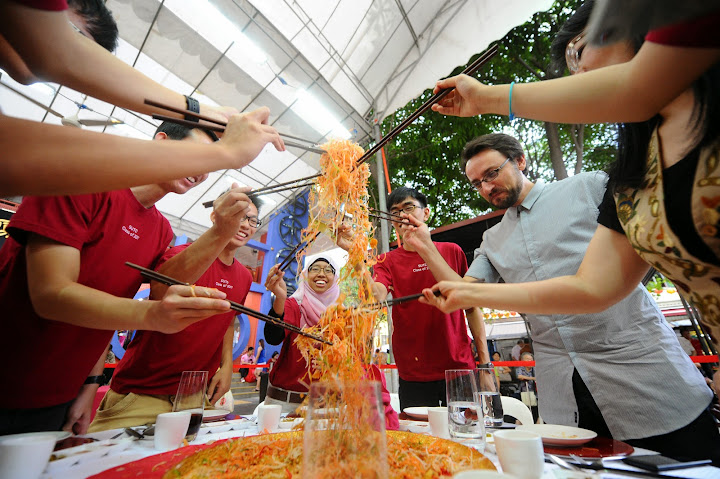 等所有材料都加好后,重头戏便开始了。所有宾客起身,用一根非常长的筷子快速地将所有材料高高捞起,不停地拌动,口中同时要说“捞起捞起”,据说,捞得越多越高,来年就会越旺。